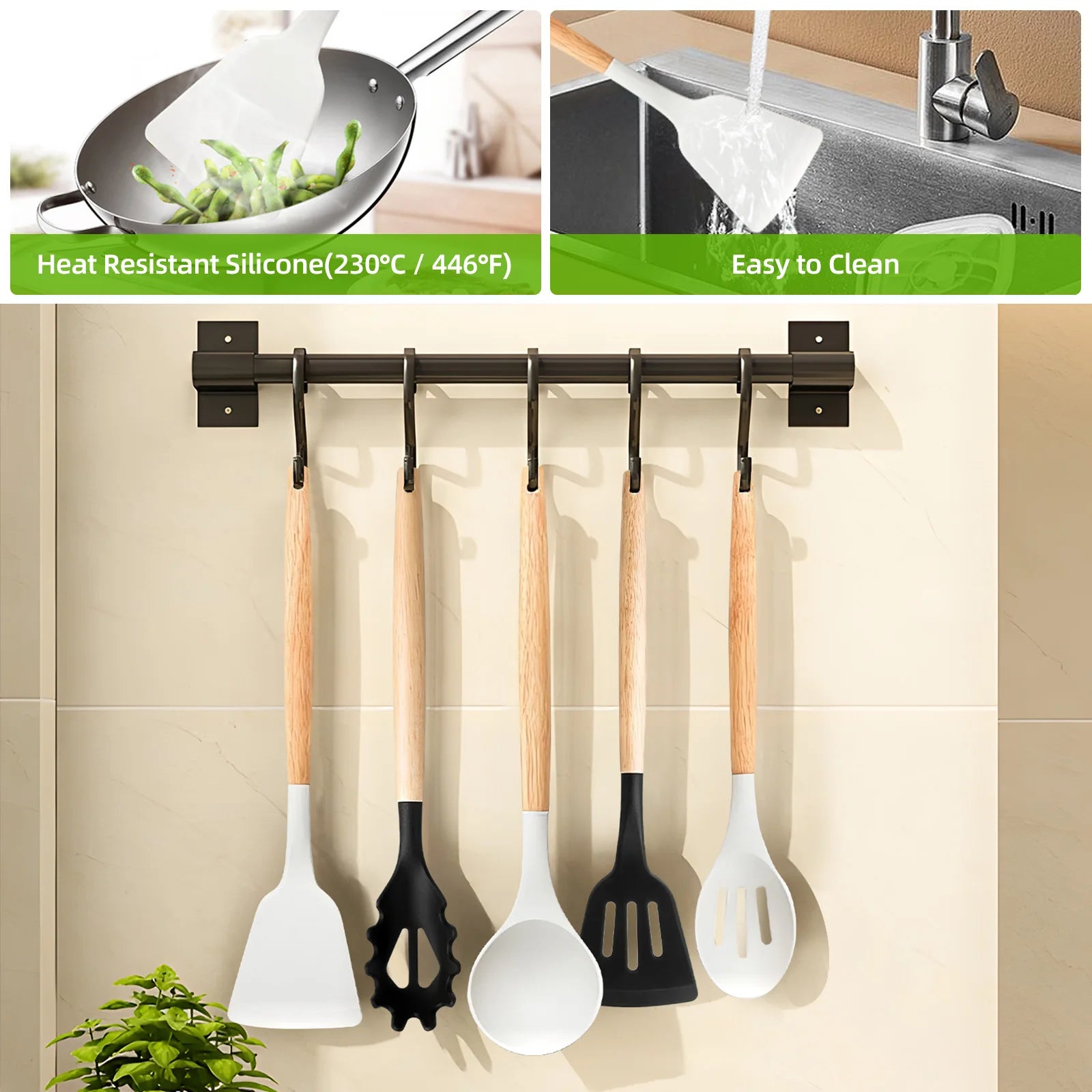 Odkryj nasz Zestaw Narzędzi Kuchennych Silikonowych Odporny na Ciepło do 230°C, stworzony z myślą o wszystkich miłośnikach gotowania. Ten wszechstronny zestaw narzędzi kuchennych składa się z 20 wysokiej jakości akcesoriów, które umożliwiają łatwe przygotowanie potraw, a przy tym są odporne na wysokie temperatury. Dzięki eleganckiemu designowi i funkcjonalności, nasz zestaw będzie idealnym uzupełnieniem każdej kuchni. Począwszy od mieszania, przez przekładanie, aż po serwowanie – nasze narzędzia sprostają każdemu wyzwaniu kulinarnemu.